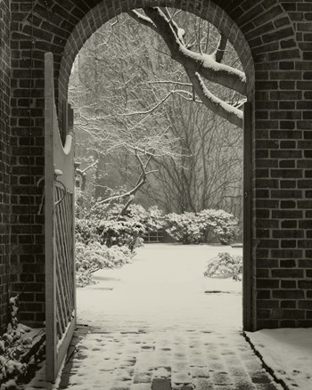A gate leading you towards the snow-covered garden