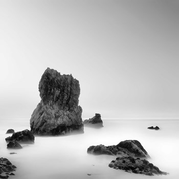 The waters of the sea blanketed by mist that embraces the rocks