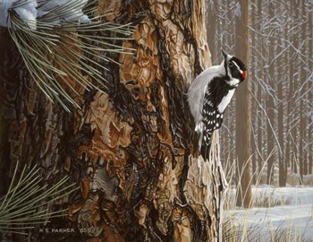 Winter Pine- Downy Woodpecker
